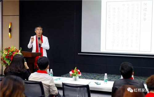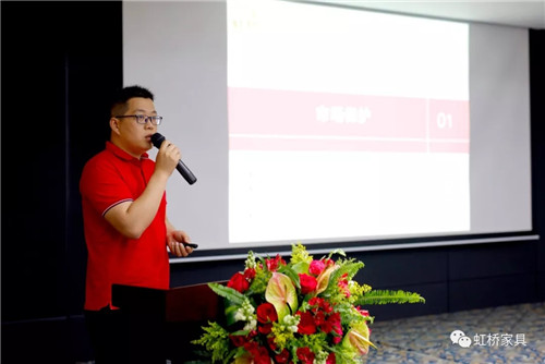 董事總經(jīng)理、虹橋首席設(shè)計師左伯良先生進行新品發(fā)布的演說,“生態(tài)辦公模式”的2018年展廳全新概念升級介紹、全新整體配套規(guī)劃,九大主推高管產(chǎn)品,展廳升級以及產(chǎn)品介紹層層推進,高潮迭起。