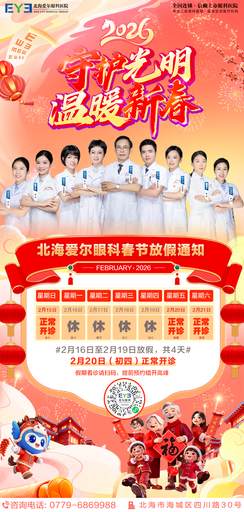 北海愛爾春節門診安排:除夕至初三休診,大年初四正常開診